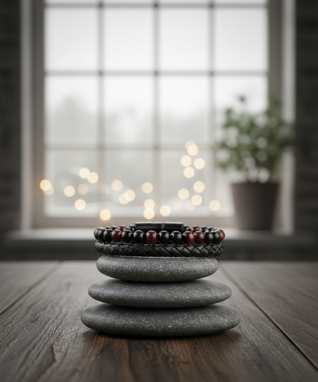 Elevate your everyday style with this premium multi-layered bracelet, a perfect blend of rugged texture and modern sophistication. This piece features a masterfully crafted combination of natural volcanic stone beads, braided leather, and high-quality stainless steel accents.